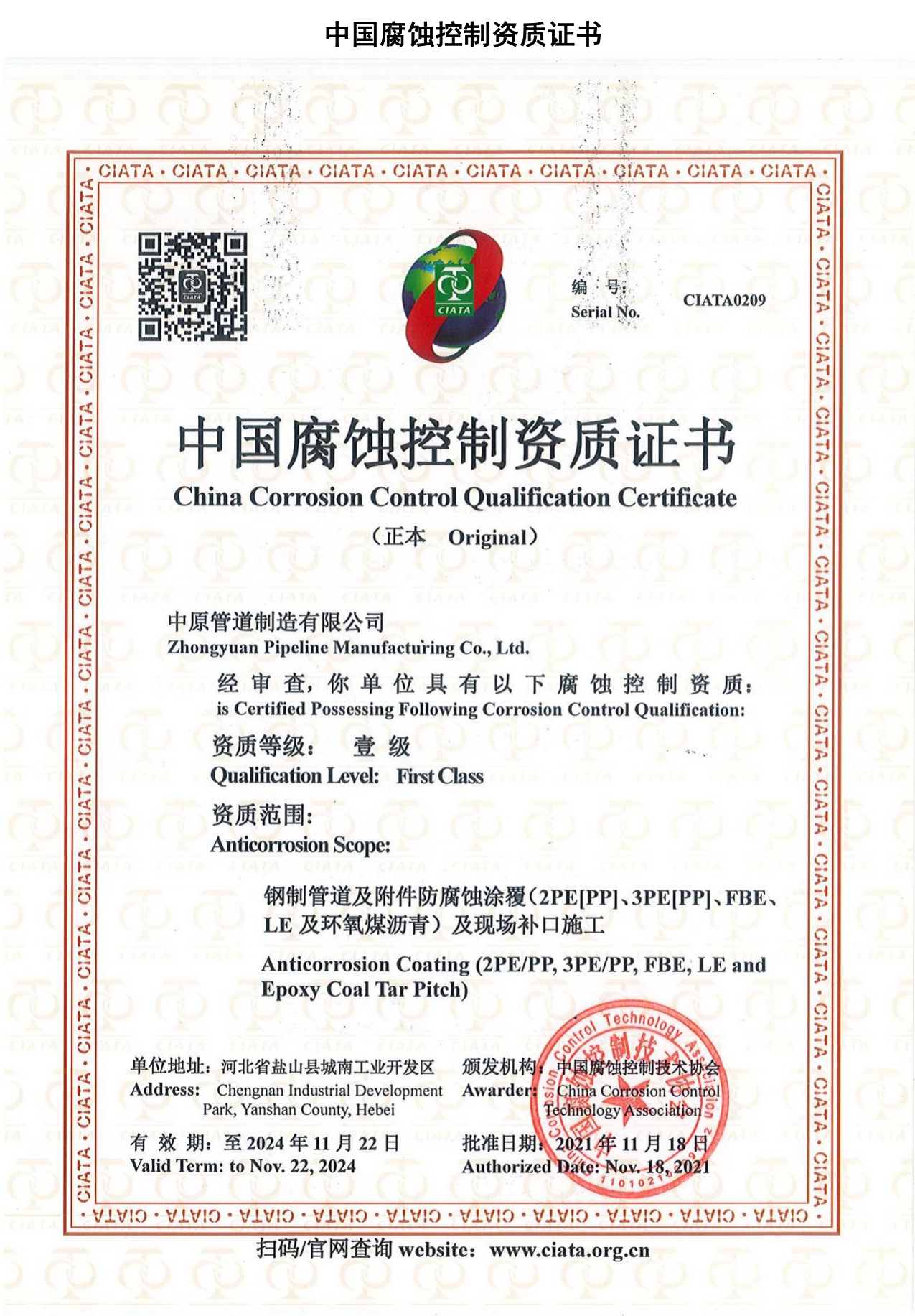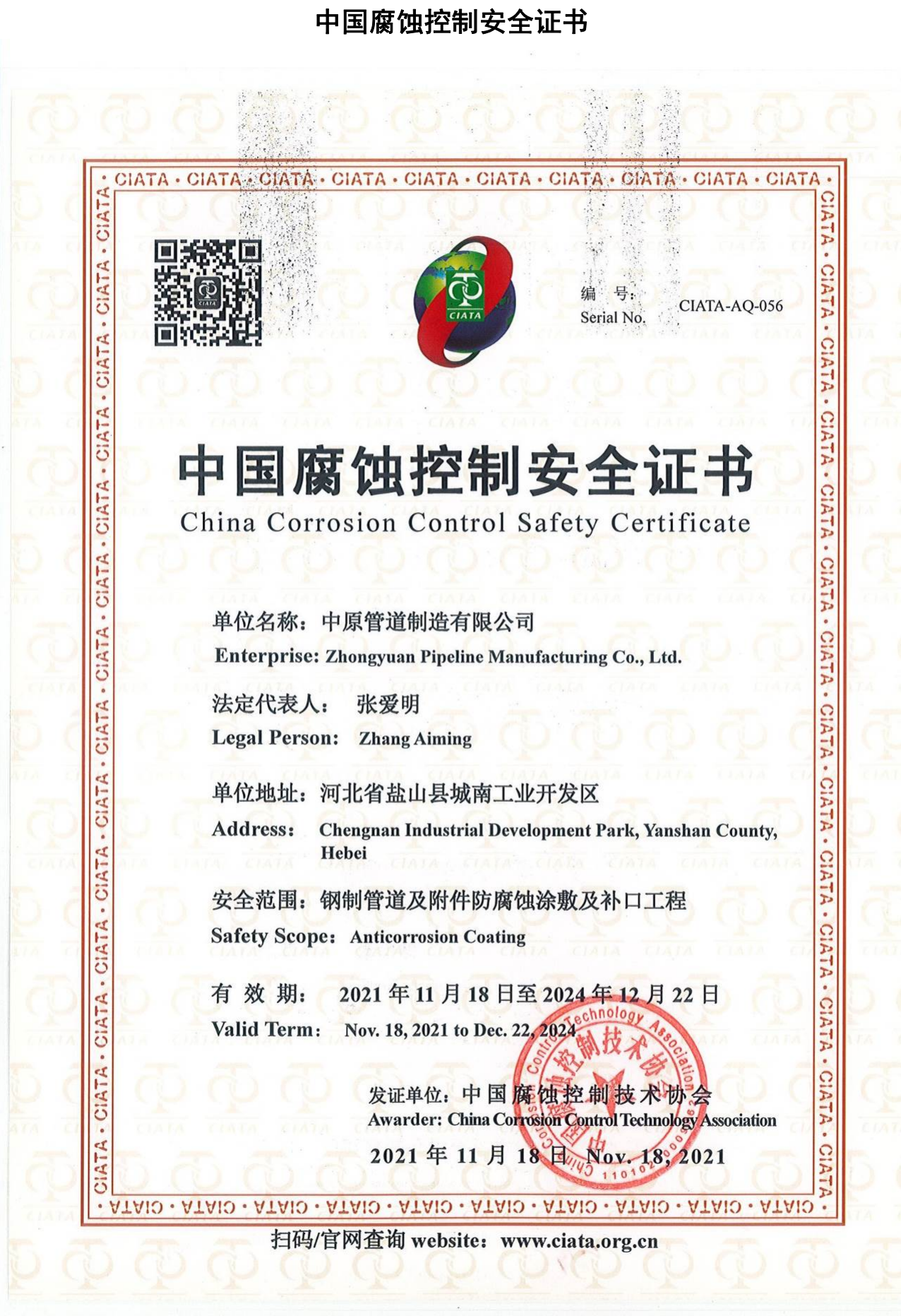环氧煤沥青钢制管道及附件防腐蚀涂资质证书